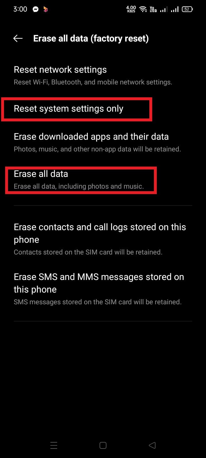 Before performing this, always keep a backup of your necessary data. Go to setting then search for reset, then you will find factory reset. Click on it, then again click on reset system setting only. Restart the device. If it doesn't work then go to the same path and click on Erase all data.